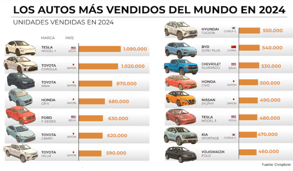 Siete modelos de marcas japonesas y cuatro de EEUU dominan el ranking de Civixplorer, que completan vehículos con partida de nacimiento en Corea del Sur, Alemania y China